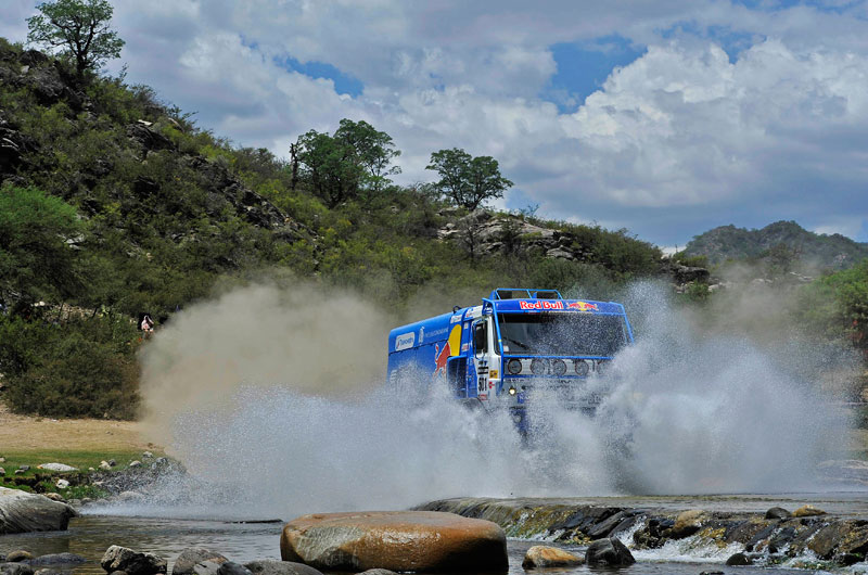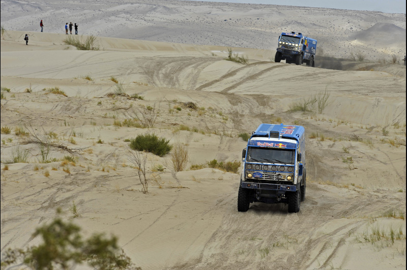 Do středeční etapy z La Rioja do Fiambaly startovali naši s těžkým soupeři před sebou. Po smolné desáté etapě, kdy měli naši dva nejlepší kamiónisté na dosah dojezd na prvním a druhém místě a kdy je o toto vítězství připravily defekty, musel včera Aleš startovat za třemi Kamazy pilotované Andrejem Karginovem – vítězem úterní etapy, vedoucím Eduardem Nikolajevem a stabilně dobře jedoucím Ayratem Mardějevem a také za našláplými Holanďany PeteremVersluisem, Peterm van den Boschem a Martinem van den Brinkem.