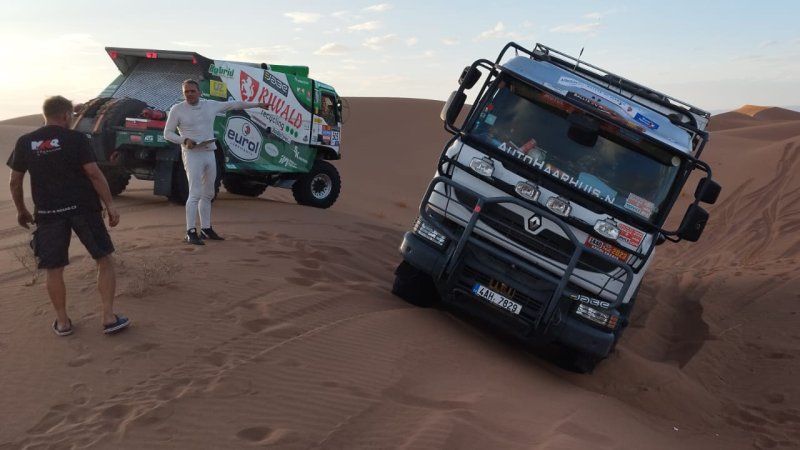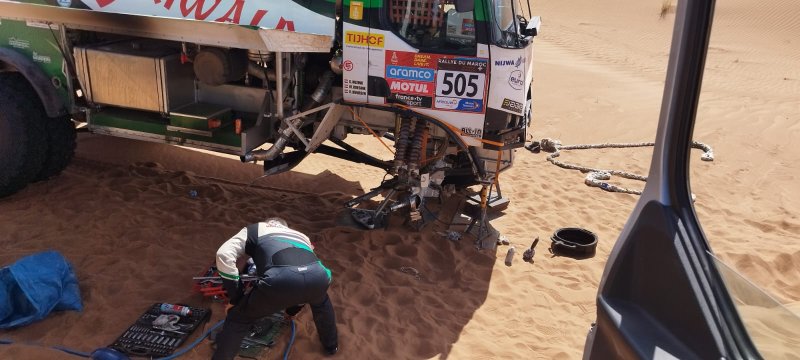 „Nikdo si nedovede představit, na čem se tu závodí. Po jednom z mnoha nárazů došlo k fatálnímu poškození pravého předního zavěšení kola a nebylo možné pokračovat dále v etapě. S naším osmadvacetitunovým servisním Renaultem Kerax jsme se vydali na záchranou akci doprostřed pouště. Po nějakých osmnácti hodinách utrpení v dunách jsme kluky našli a pustili se do práce,“ popsal strasti během závodu člen mechanického týmu MKR Technology David Sova, když hned doplnil: „Práce, která na dílně trvá pět až šest hodin, jsme v nestabilních dunách při teplotě 45° zvládli za sedm. Na cestě do bivaku nás ale chytla tma a my servisák utopili v trychtýři mezi dunami. Dalších pět hodin jsme se ve tmě dostávali ven. Byli jsme fyzicky i psychicky úplně vyřízení.“