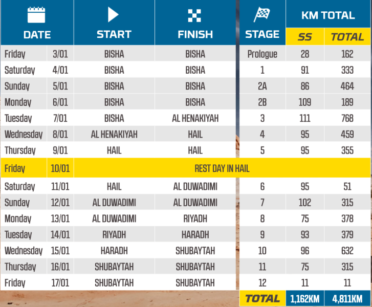 Trasa začíná v Bisha a táhne se asi 7 700 kilometrů, včetně 5 100 kilometrů speciálů. Poprvé se pojede pět rychlostních zkoušek na samostatných tratích pro vozidla FIM a FIA, což představuje 45 % měřené vzdálenosti.